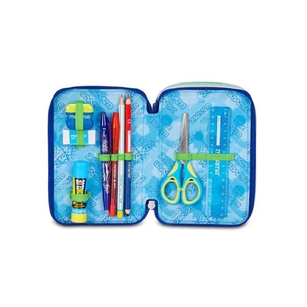 ASTUCCIO SEVEN 3 ZIP WRITE DOWN Astuccio Seven 3 zip con tre scomparti in cui troverai tutto il materiale necessario per la tua giornata di scuola. Caratteristiche Tecniche Dimensioni 12,5 x 20 x 7 cm CONTENUTO 45 PEZZI: 1 Penna cancellabile blu, 1 Penna a sfera rossa, 18 Pastelli a colori 4.0 esagonali, 18 Pennarelli superlavabili punta 3.0 mm, 1 Matita grafite esagonale HB, 1 Colla stick, 1 Gomma, 1 Temperino barilotto a 2 fori, 1 Righello, 1 Pastello Tondo 4.0 Bicolor, 1 Paio di Forbici in metallo Tasche Triplo scomparto Tessuto Poliestere