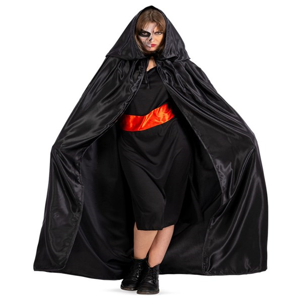 Mantello in raso nero con cappuccio l.cm.130 ca. in busta con gancio Cod. Art.: 29223 Conf. 1 pezzo Mantello in raso nero con cappuccio, lungo cm. 130. Taglia unica adulto. Accessorio per adulto, adatto a completare diversi tipi di travestimento. Confezione Peso conf. singola (Unità di vendita) 0.230 Kg Imballo 1 pezzo