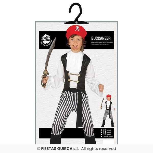 Adatto a bambini 3/4 anni CM. 105 Tema Pirati Componenti Camicia, Cintura, Fazzoletto, Pantaloni Ferro da stiro a vapore No Materiale Poliestere